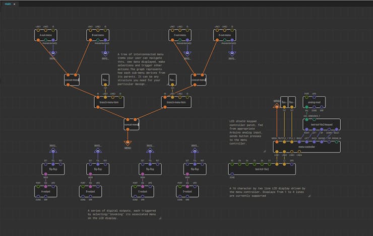At the top of the sketch screenshot is a tree-like structure which, when compiled and the final output "root" of the tree is routed to the menu-controller input that accepts it, will automatically generate a navigable menu just as pictured in the graphical designer. Currently implemented are three types of menu tree nodes, a "leaf"-type menu - a final sub menu, with no orange-colored input ports - this represents some action or parameter the user can control, a "branch"-type menu with both an input and output, where the user can select among several child sub-menus, and a "concat"-type menu where sub-menus are grouped together and fed into the input of a branch-type menu, to make a group of options. It should hopefully be somewhat self-explanatory from the diagram how to wire up this set of nodes.