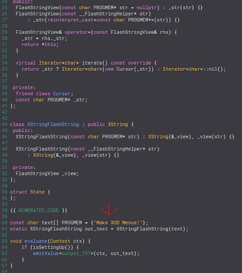 Using the flash-string type nodes isn't too painful but does require duplicating the patch and code for each new string stored in program memory, and clicking into the C++ code contained within the node itself to edit the output string: