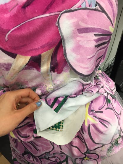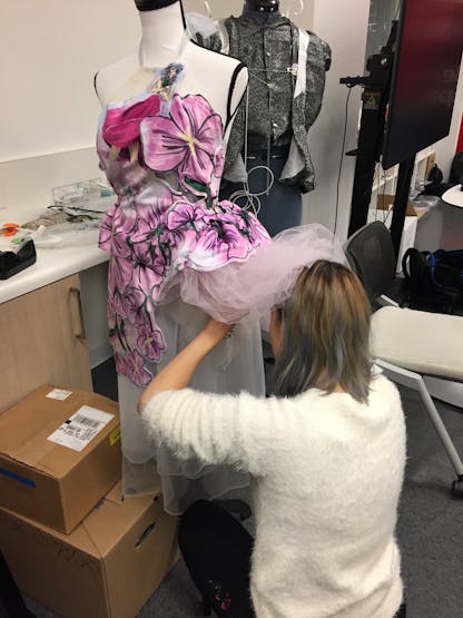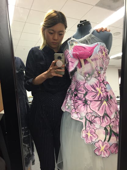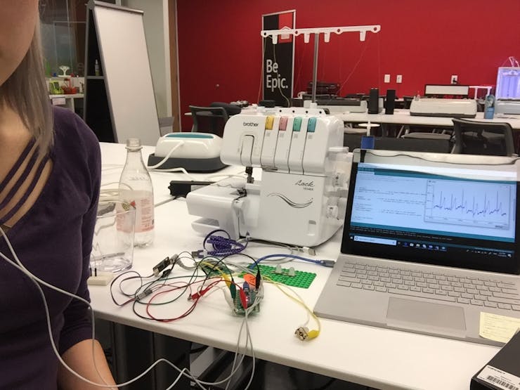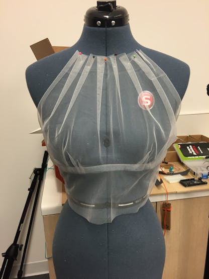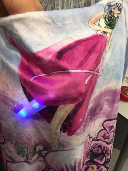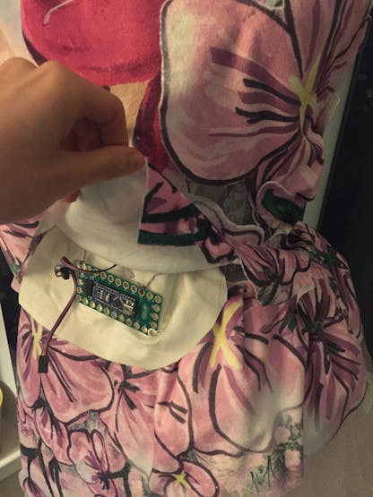 In the middle of the project, Make: came to The Garage, Microsoft to do a Wearables Tech 101 workshop. I was the instructor and used this dress as an example of how to scale the skills we learn in the workshop to a real garment.