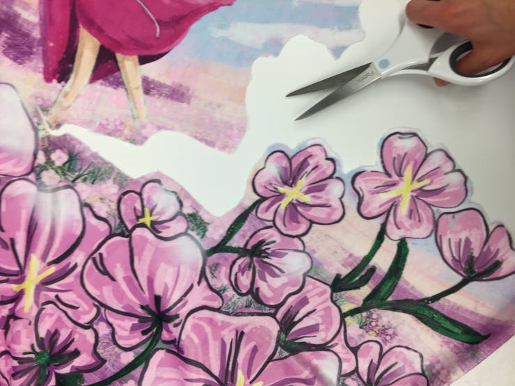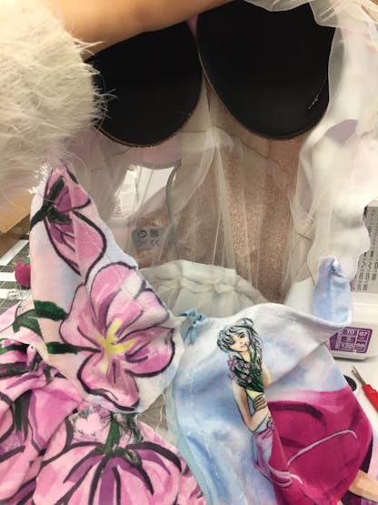 Now I need to design the placement of the graphics. I decided to cut the flowers and human figure out according to their shapes. Then stitch the parts together onto the tulle layer piece by piece. There's a lot of manual work.
