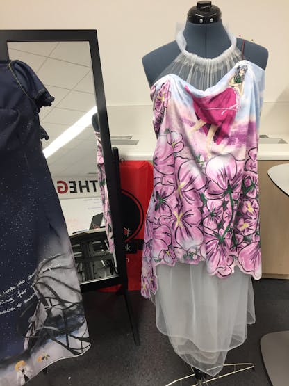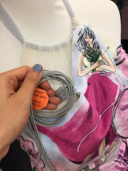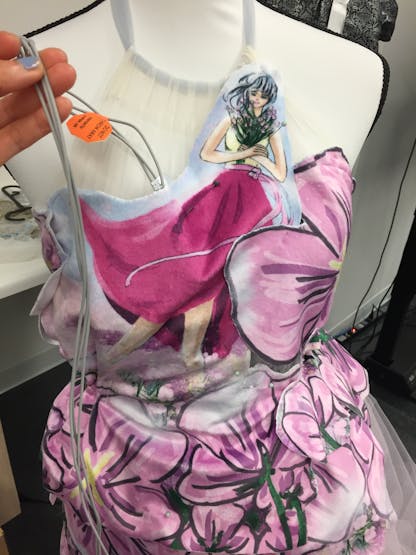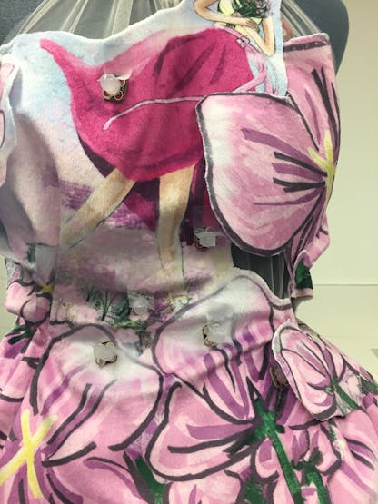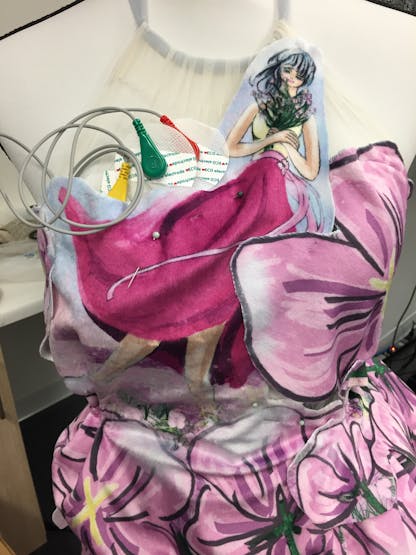 A dress with my painting of flowers on the fabric; fireflies in the flowers blink according to wearer's heart-rate.