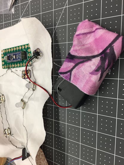 I always test how thinks would look before construction. The LEDs should shine through the fabric. This is not the actual placement. I just needed to see how bright they show up.