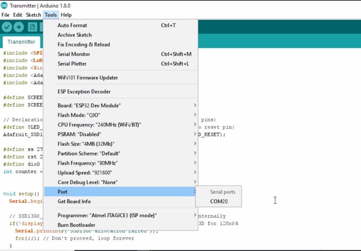 As soon as power is given to both the modules the OLED on the transmitter starts showing the packet number that is being sent, on the other hand the Serial monitor connected to the Receiver shows the received packet with the signal power