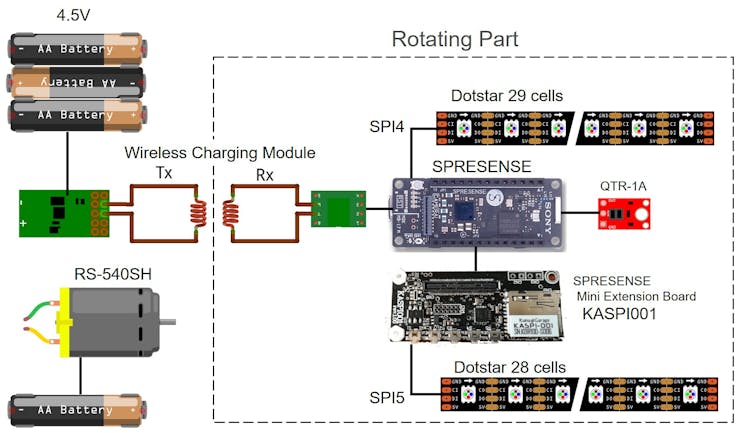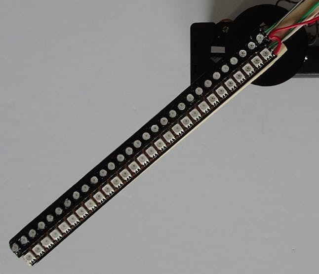 #include <SPI.h> #include "Adafruit_DotStar_SPI5.h" #include <Adafruit_DotStar.h> #include "graphics.h" #define NUMPIXELS2 29 // Number of LEDs in strip #define NUMPIXELS 57 // Number of LEDs in 2 strips #define Frame 16 #define Div 150 #define Fclk 26000000 #define itrPin 19 int numRot = 0; int numDiv = 0, numDiv2 = 0; int stateDiv = 0; unsigned long rotTime, timeOld, timeNow; Adafruit_DotStar_SPI5 strip5 = Adafruit_DotStar_SPI5(NUMPIXELS2, DOTSTAR_BGR); Adafruit_DotStar strip4 = Adafruit_DotStar(NUMPIXELS2, DOTSTAR_BGR); void setup() { Serial.begin(115200); strip5.begin(); SPI5.beginTransaction(SPISettings(Fclk, MSBFIRST, SPI_MODE0)); strip4.begin(); SPI.beginTransaction(SPISettings(Fclk, MSBFIRST, SPI_MODE0)); strip5.clear(); strip4.clear(); strip5.show(); strip4.show(); delay(500); attachInterrupt(digitalPinToInterrupt(itrPin), RotCount, FALLING ); } void loop() { if(stateDiv == 1 && micros() - timeOld > rotTime / Div * (numDiv)){ stateDiv = 0; } if(stateDiv == 0 && micros() - timeOld < rotTime / Div * (numDiv + 1)){ stateDiv = 1; strip5.clear(); strip4.clear(); for(int i=0;i<NUMPIXELS2; i++){ numDiv2 = numDiv+2; if(numDiv2 >= Div) numDiv2 -= Div; strip5.setPixelColor(i, pic[numRot][numDiv2][i*2]); strip4.setPixelColor(i, pic[numRot][numDiv][i*2+1]); } strip5.show(); strip4.show(); numDiv++; if(numDiv >= Div ) numDiv = 0; } } void RotCount() { timeNow = micros(); rotTime = timeNow - timeOld; timeOld = timeNow; numRot++; if(numRot >= Frame) numRot = 0; }