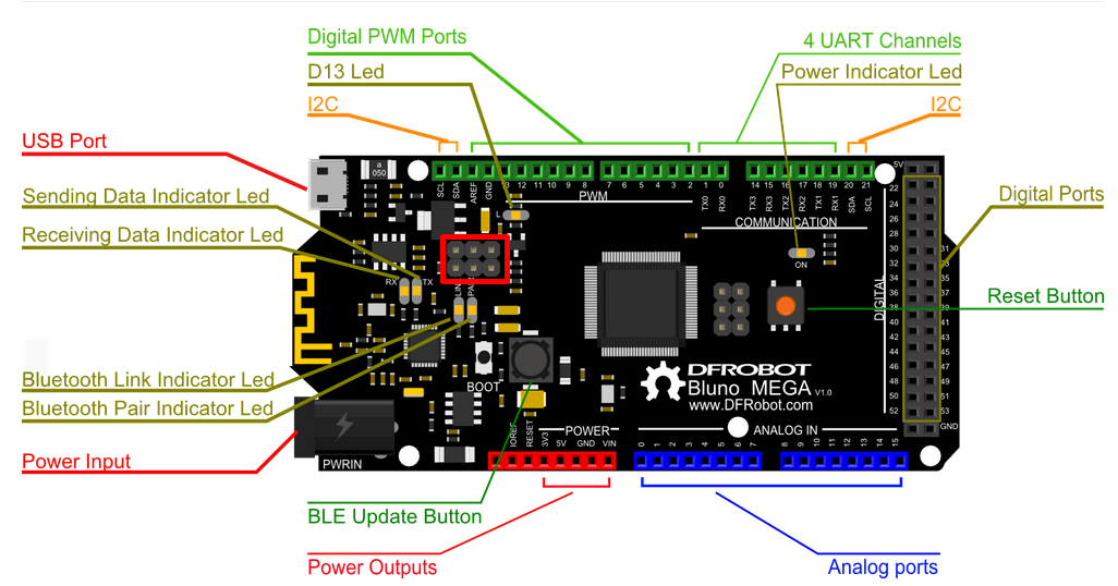 The Bluno Mega1280 is almost same to Arduino Mega1280. just add a bluetooth on the board.