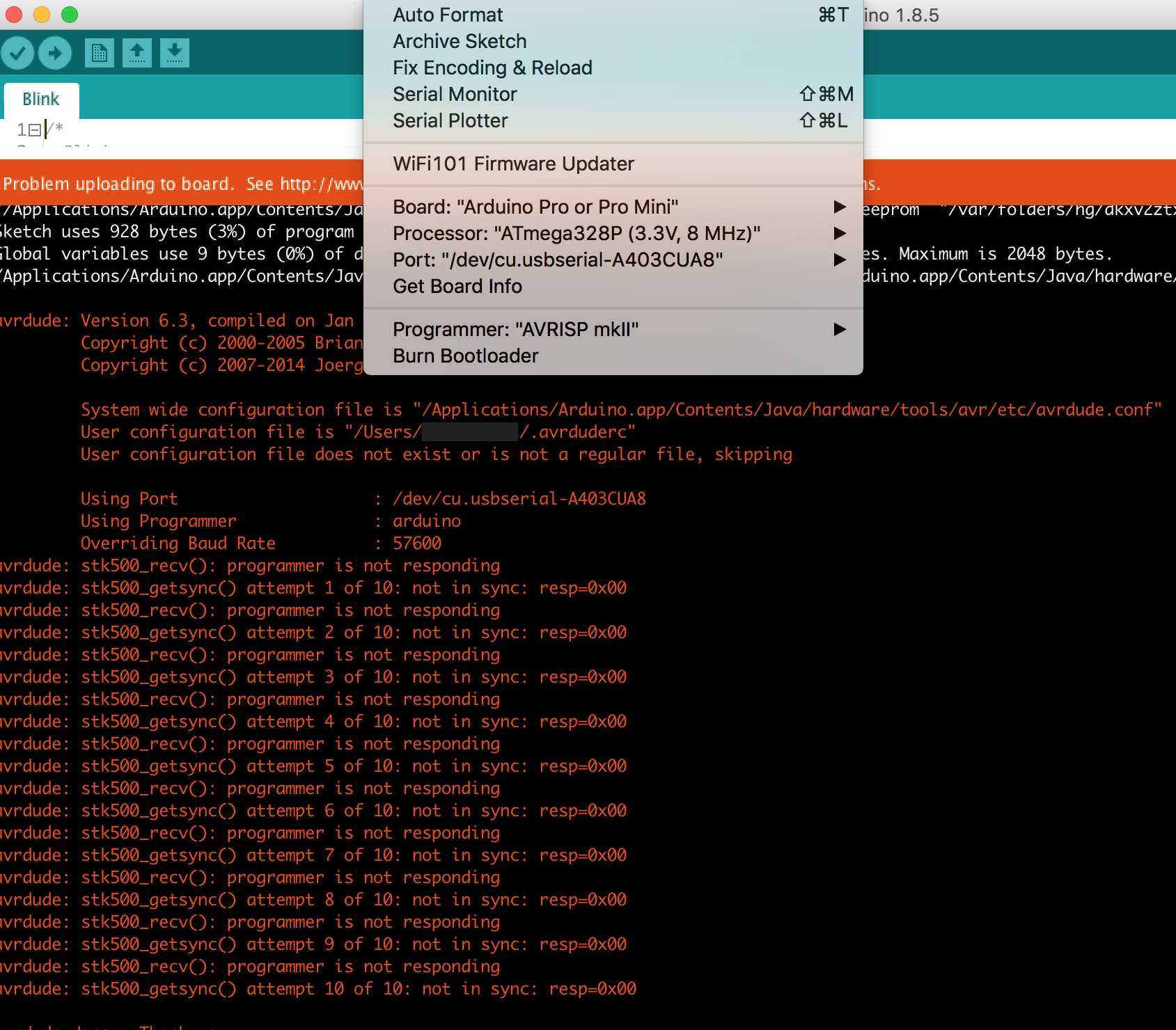 avrdude: stk500_getsync() attempt 1 of 10: not in sync: resp=0x00