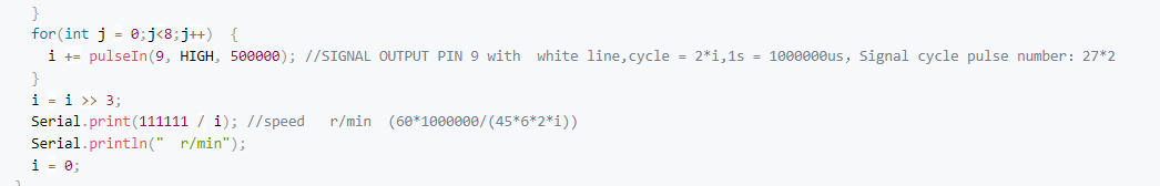 JaneYu Hi. I got one of these motors and plugged it in to an Arduino Uno and it works great - smooth, torquey and quiet. I can control the speed and direction. But in your sample code I don't understand what you are doing in the j loop. Why loop 8 times on pulseIn? What is the right bit shift (i = i >> 3) doing? Why divide 111111 by i ? And finally, why is cycle = 2 * i ? THanks so much!