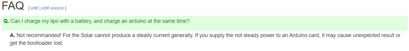 Please can you explain the difference between these statements. From this discussion you say: "Yes, you can charge the battery and power ESP8266 at the same time." but in the FAQ it states: "Q. Can I charge my lipo with a battery, and charge an arduino at the same time? A. Not recommanded! [...]" Please can you explain why ESP8266 is different from arduino in this case.