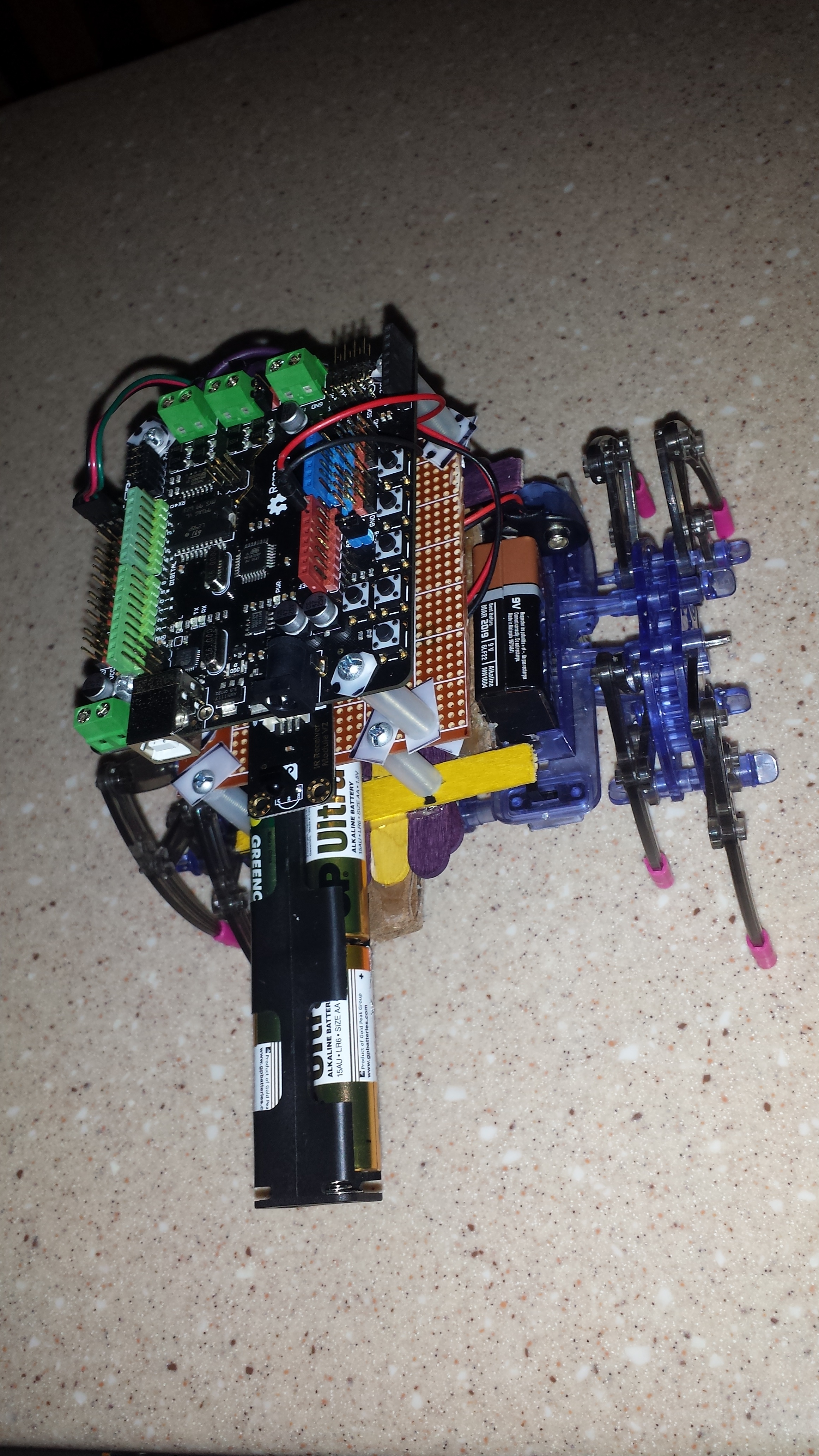 The final robot has a x4 AA battery pack to power the motors and a 9V battery to power the Controller.