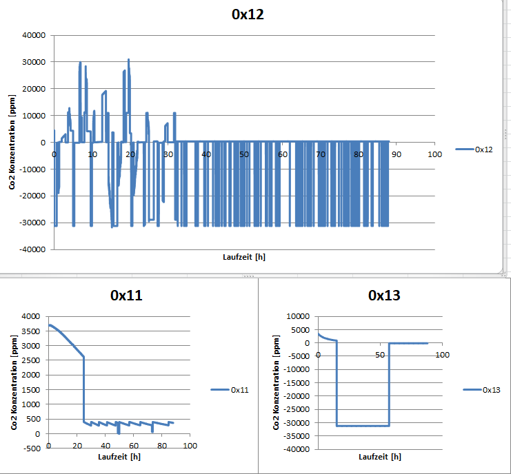 The four Sensors are printed wrong values such as -31000, or 10. The running time was 88 hours and sometimes they are printed wrong values (see at the picture). I have alreeady done the calibration with the four purchased sensors. In "normal" ambient they run perfectly.