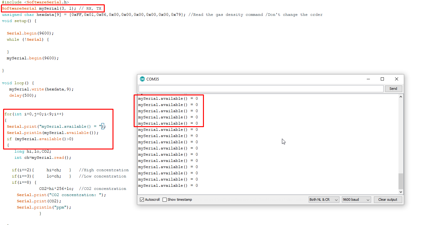 unsigned char hexdata[9] = {0xFF,0x01,0x86,0x00,0x00,0x00,0x00,0x00,0x79}; //Read the gas density command /Don't change the order