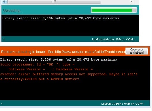 The problems symptoms were that the code would compile quickly and without error [top picture]. Then when the IDE began to upload an error was displayed [bottom picture] .