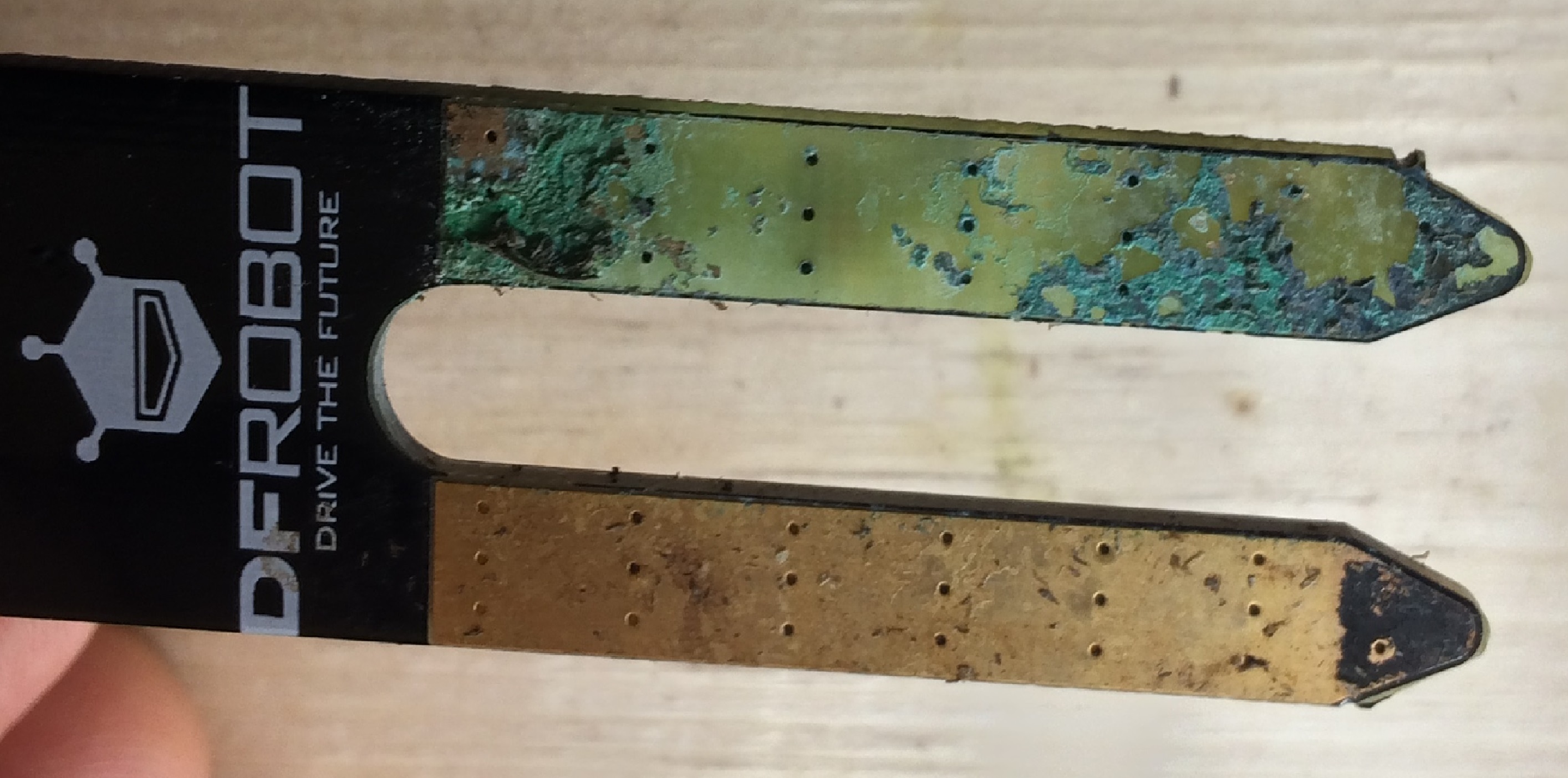 After a month continuously powered at 3.3v and in wet soil, all the SEN0114 used had no more plating on the branch connected to Vcc (the second branch is still fairly ok). See picture below.