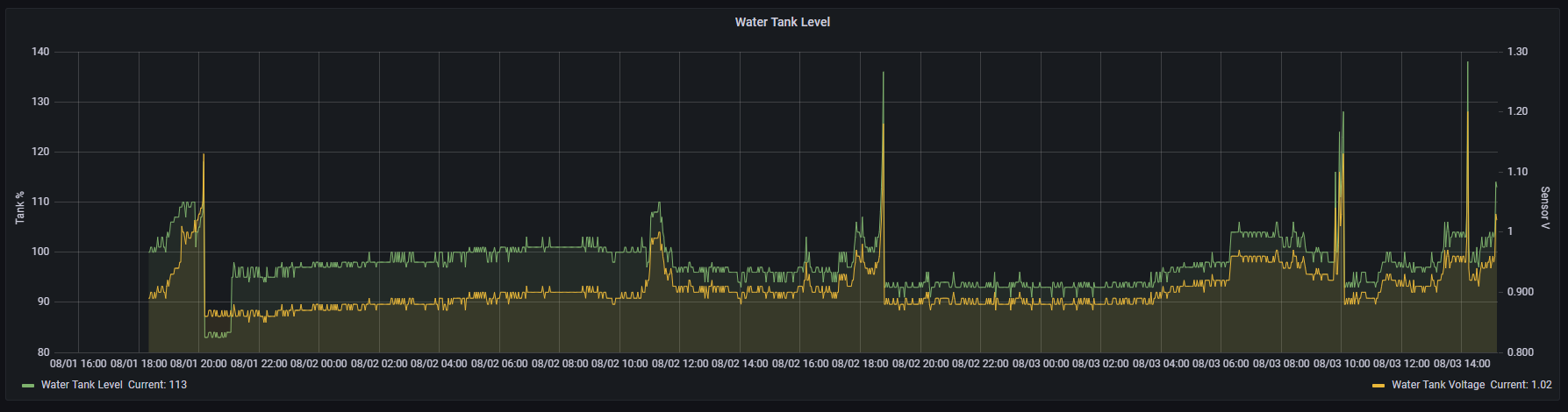JaneYu I have a thrown in level sensor from dfrobot https://uploads.disquscdn.c... connected through a current to voltage converter and a node MCU. I get the random voltage spikes and voltage variations throughout when no water is being added or removed see below. Can someone please help? Could this be related to the tank heating up and the water inside as the sun hits the western side of the house in the afternoon. Because it is always in the afternoon around the same time. Is anyone else seeing this?