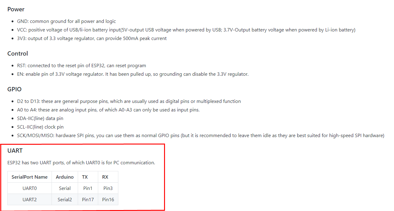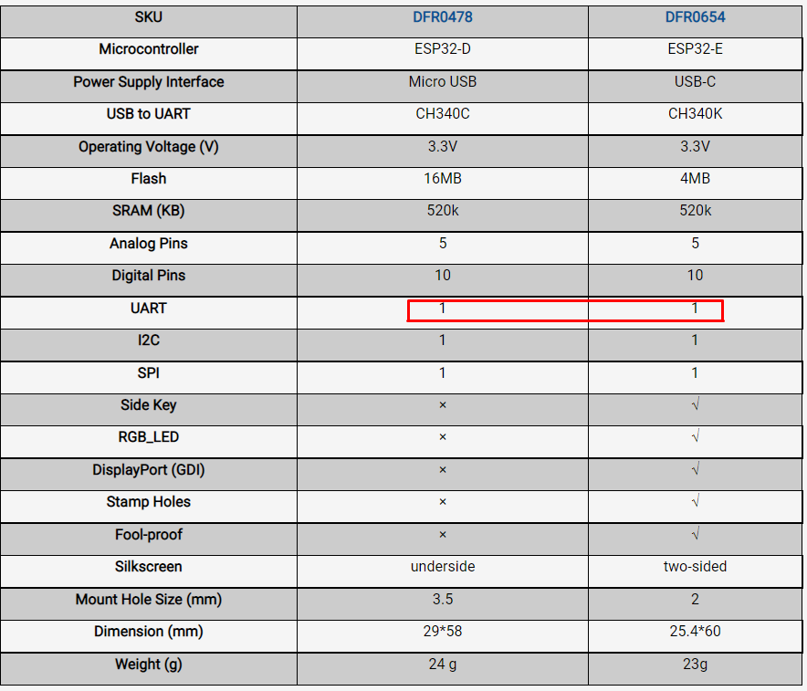 Hi. Does the module have 2 UARTS(0 and 2), or only 1 for the usb communication. In the wiki you state 2 UARTS, but in the comparison chart between this and the firebeetle 1, it seems that they both have 1.