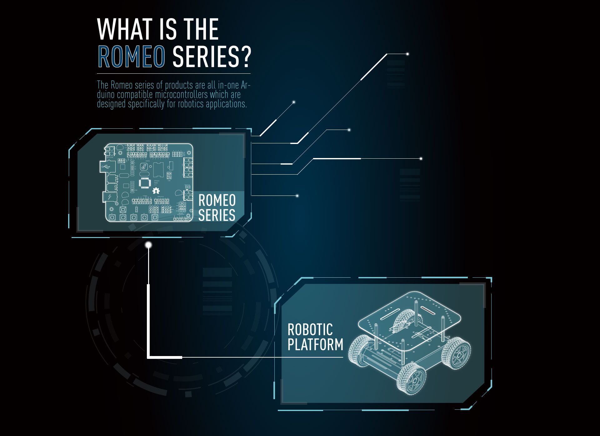 Products in the Romeo series are specifically designed for robotics applications and extended devices. They all integrate 2-way DC motor drivers, wireless sockets and PWM/PLL control modes. No more messing around with breakout boards - start your project immediately using just one board!